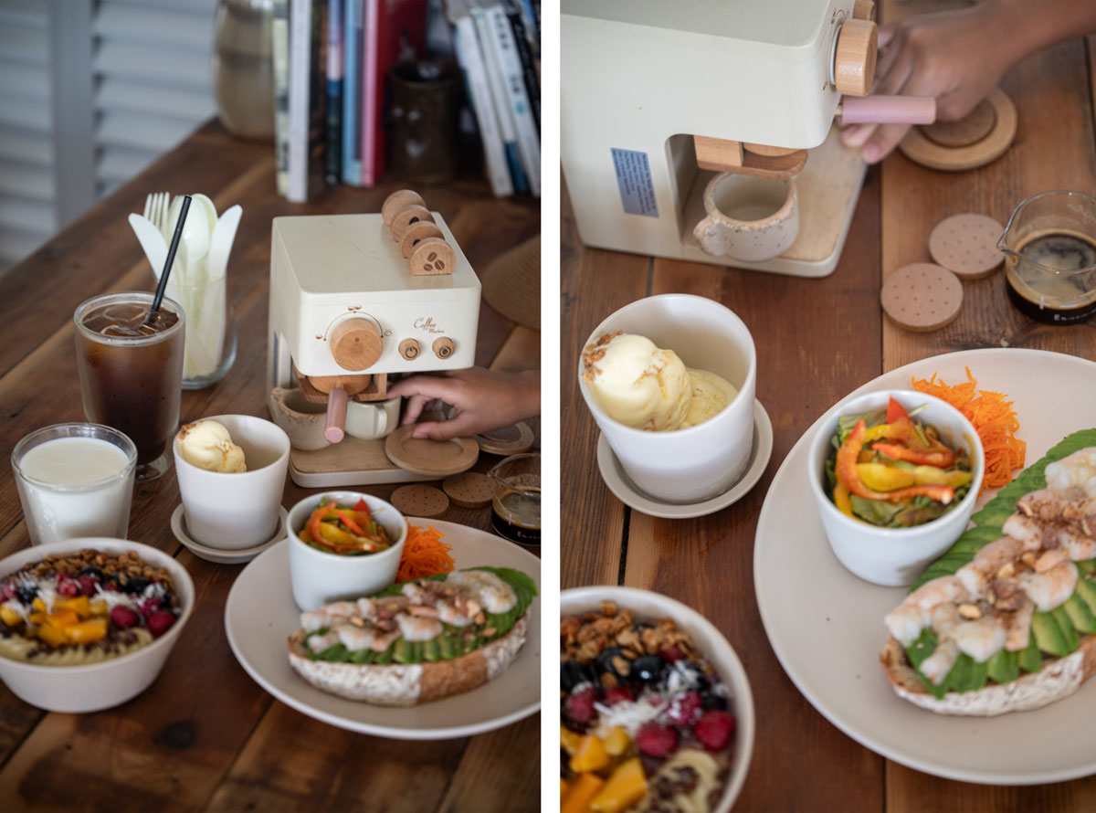 你問我沖繩最美好之處?實在太多,但其中一個讓我們喜愛的原因,許多有著戶外慵懶坐位餐廳,都有著不擁擠,也沒有怕小孩太吵的壓力,大人能好好吃一頓飯,孩子也能在平坦草地平坦上活動,一旁還有盪鞦韆與吊床,這樣的自在,是沖繩旅行中最難得的幸福感受。Bottle Palm Garden(ボトルパームガーデン)」早餐菜色有適合海島的「季節水果的 acai bowl」、「煙燻鮭魚與奶油乳酪三明治」、「自家製阿古豬香腸熱狗」等等。