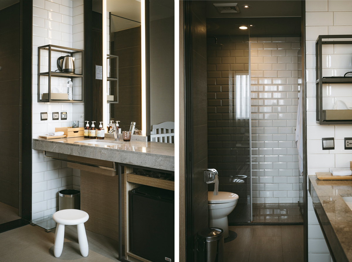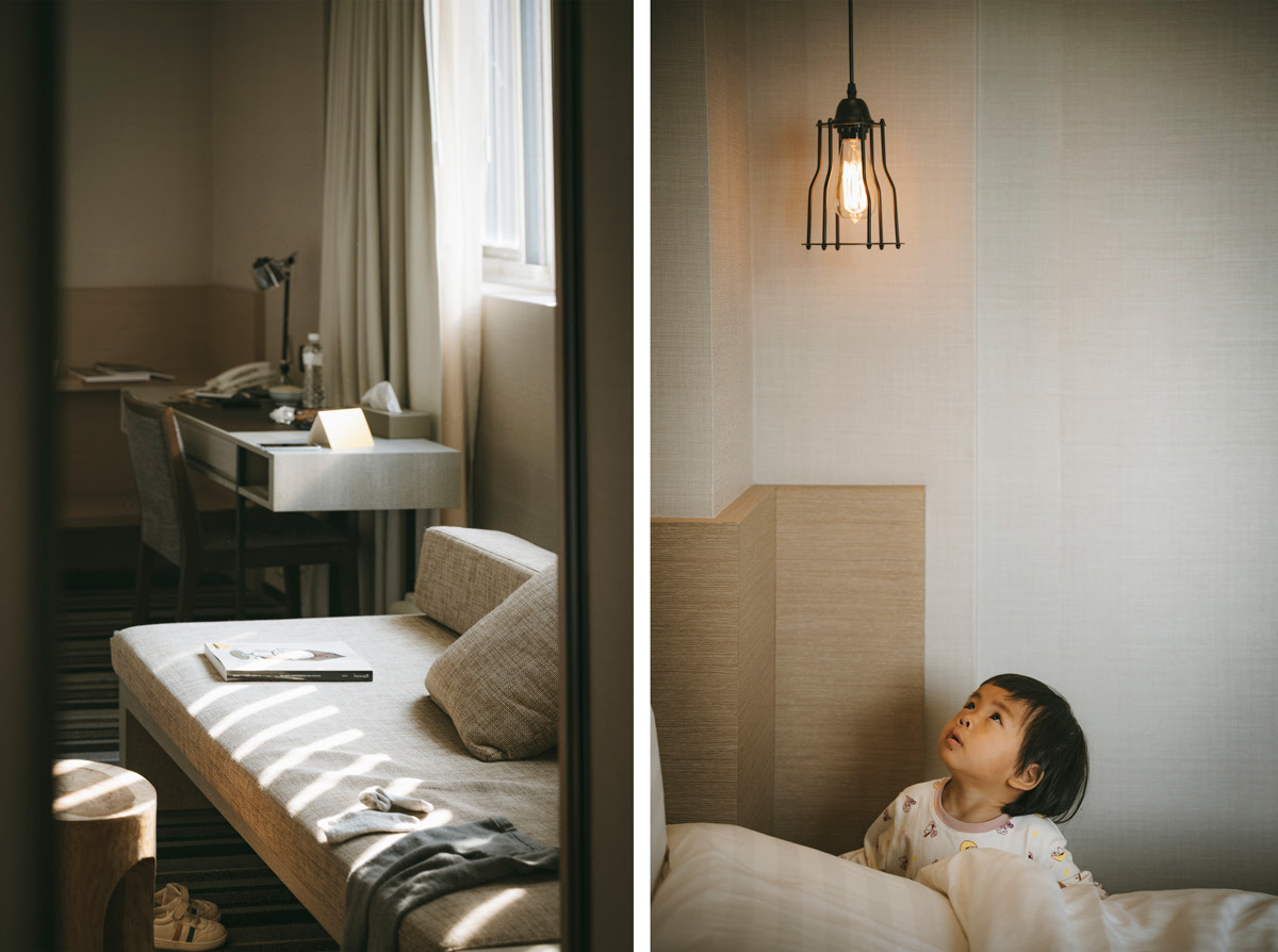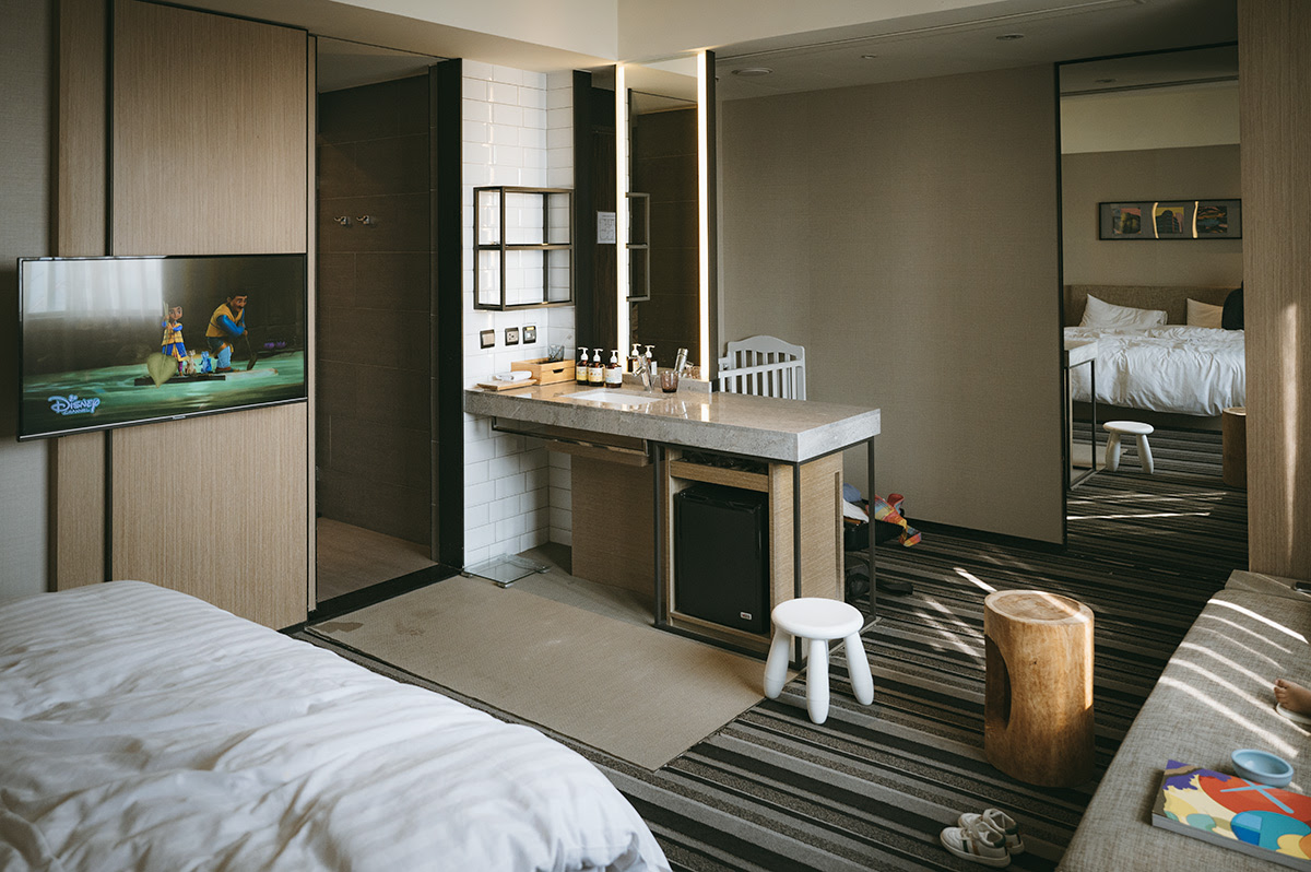 這次入住的房型,是一張大床與沙發、乾溼分離的空間,由於房價並不高,我建議如果是家庭客,可以直接選擇四人房,兩張大床的空間更適合家庭入住。這次入住的豪華房,雖然只有附設一張雙人床,但整間室內空間仍相當寬敞的保留給了沙發區,還有一處我很愛的獨立衛浴外的洗手台! 讓時常需要清洗小孩餐碗,還有一直給小孩清洗的媽媽我,很方便的空間呢! 嬰兒車、兩個29吋行李箱放在房內,也都沒有問題!