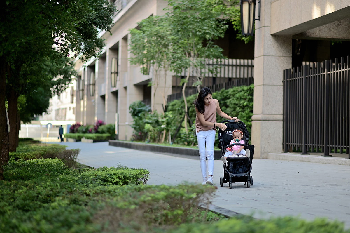 現在看屋,跟以前心態不同,以前小夫妻兩人,住的稍微離市區遠一點,要到哪開車、騎車都很方便,但是現在要帶著Dory 到處跑,住家附近生活機能,徒步推嬰兒車就要可以到的超市、公園,採買等因素就變得相當重要,當然還有學區,以及先生上下班附近交通便利等,都是我們現在換屋要考量的因素。 而這次看的建案和發LA VIE,當時聽說建案位置在舊市區,還沒去看之前想說,建案附近環境應該會很吵雜、壅擠,結果一到現場,我們發現完全是繁華市中心的祕密花園啊,因為位置在舊市區,所以生活機能相當好,國小、國中就在旁、桃園相當熱鬧的採買商圈中正路、民生路,轉出去巷子就可以到,而且在這樣的機能下,建案前還能有雙排樹景、人行道退縮七米、棟距二十米以上的幽靜環境感,光是完整的人行道可以讓我推嬰兒車散步,我就超級喜歡啊,但是,比較可惜的是我們當天來看時,銷售人員說已經全部完銷了啊。