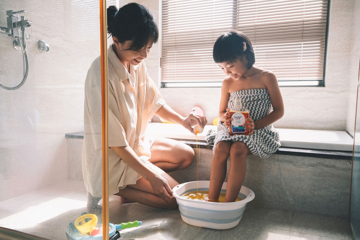 下圖/放學回到家洗完澡,午睡前我還是習慣讓她洗腳後再進房睡覺,這時候沙威隆潔身液就超好用,一瓶礦泉水量(500毫升)對潔身液約1瓶蓋量(25毫升)就可以清潔殺菌!